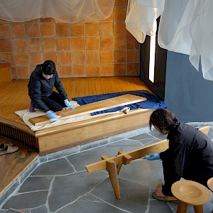 テーブルは清掃後、蜜蝋を主成分とした家具用ワックスを塗布した。腰掛(大)(小)は敷物と背もたれを刷毛と掃除機で清掃した後にテーブルと同じワックスを塗布した。籐の敷物も移動させながら掃除機を使い清掃を行った。床部はポリプロピレン紙のモップで表面を清掃した後に、市販のフロアー用水性ワックスを3回塗布した。