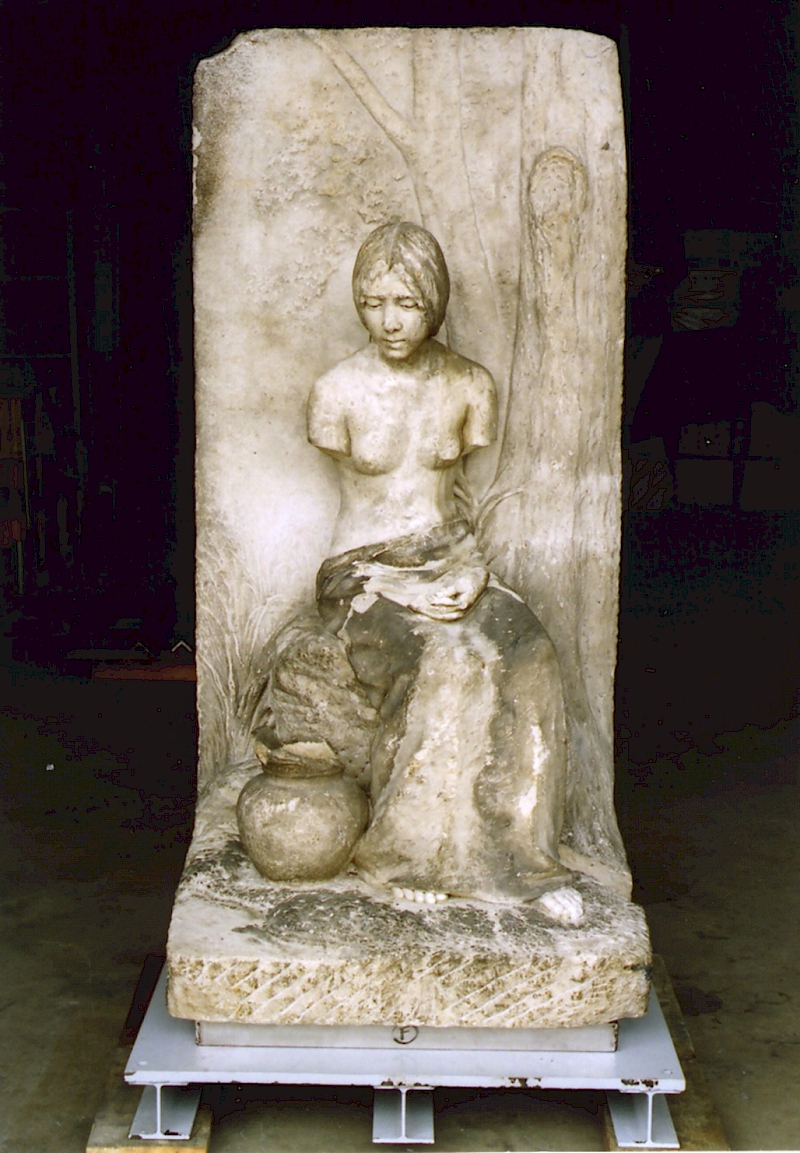 本作品は明治から大正期に活躍した彫刻家北村四海(1971-1927)の代表作で、明治42(1909)年、第3回文展(文部省美術展覧会)の出品作である。文展終了後塾員山下吉三郎氏の仲介で創立五十周年記念図書館の新築祝いとして慶應義塾に寄贈されることになり、明治45(1912)年4月に竣工した図書館玄関ホールに設置された。その後、1945年5月の東京大空襲によって被災し、戦後まもなくより図書館地下の倉庫に収納され、そのままの状態となっていた。1999年、倉庫の改修工事計画により作品搬出が必要となり、調査が行われ、修復・再展示について検討されることとなった。この作品の詳細および、再発見時状況については、下記の柳井論文を参照。専門家の調査結果を経たこの柳井氏の提言を受けて、2005年度美術品管理運用委員会にて本作品の修復・再展示が検討・承認された。修復にあたっては、本作品が経てきた歴史的痕跡を留める方針とし、欠損部分は補填せず、戦禍による痕跡についても残すこととなった。また、2006年度同委員会において、同方針が再確認され、同時に展示時には歴史的痕跡について鑑賞者の理解に資する説明等を併設することが不可欠ということも確認された。