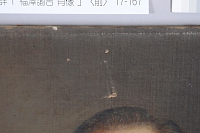 ・絵具層:画面全体が砂埃や塵などで汚れている。額縁の入子で隠れていた上辺と左辺は汚れの付着は少なく、下辺部68と右辺は非常に汚れが溜まった状態になっている。下辺部には黴が発生しチョーキングしている。また黒色の衣服もチョーキングを起こしている。 画面向かって右側の胸部に擦れが原因の破損箇所がある。破損の長さは天地に25mmほどある。頭の上部にも擦れによる剥落がある。右胸、ネクタイ周辺にも剥落箇所がある。亀裂は細かく全面に観察できる。虫糞が付着している。