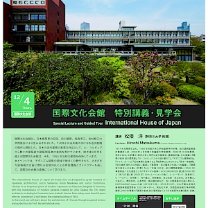 国際文化会館は、日本建築界の巨匠、前川國男、坂倉準三、吉村順三の共同設計により生み出されました。7代目小川治兵衛の手になる近代庭園の傑作と調和した日本の近代建築の重要な作品として、ル・コルビュジエら数々の建築家や建築関係者が来訪する国際文化会館は、竣工後60年を超える今も、1955年当初の建物を保持しています。 本イベントでは、モダニズム建築の領域で数多くの著作をもち、さまざまな建築展の企画に携わる松隈洋氏による特別講義とガイドツアーを通して、国際文化会館の建築について学びます。