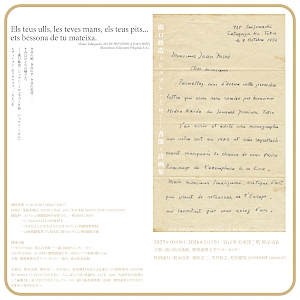 1940年、瀧口修造は世界でもっとも早いジュアン・ミロのモノグラフ『ミロ(西洋美術文庫48)』(アトリヱ社)を上梓した。1958年、瀧口はヴェネツィア・ビエンナーレの日本代表兼審査員として渡欧し、欧州旅行を行ったが、その際ミロと会うことを望みながらも叶わなかった。ミロへの継続する関心を持ちながら実際2人が出会ったのは1966年のミロ初来日の際だが、その後2人の関係は2つの共作詩画集『手づくり諺 ジョアン・ミロに』(1970年)、『ミロの星とともに』(1978年)として結実した。本展では、その制作過程を示す書簡、およびその他関連資料を通じて、瀧口とミロがどのような問題を共有し、どのように触発し合っていたのかについて考える。