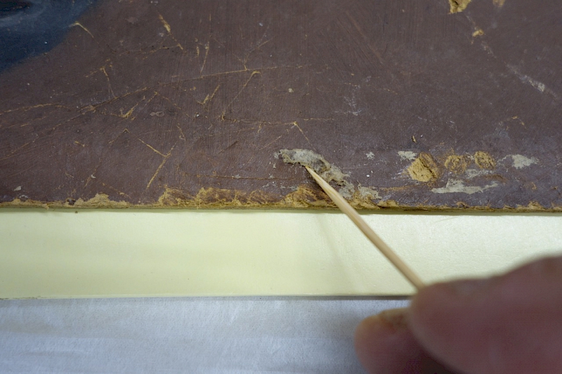 7.炭酸カルシウムを膠水(10 %)で練り合わせて充填剤を剥落箇所に詰め、周囲の絵肌に合わせて整形した。